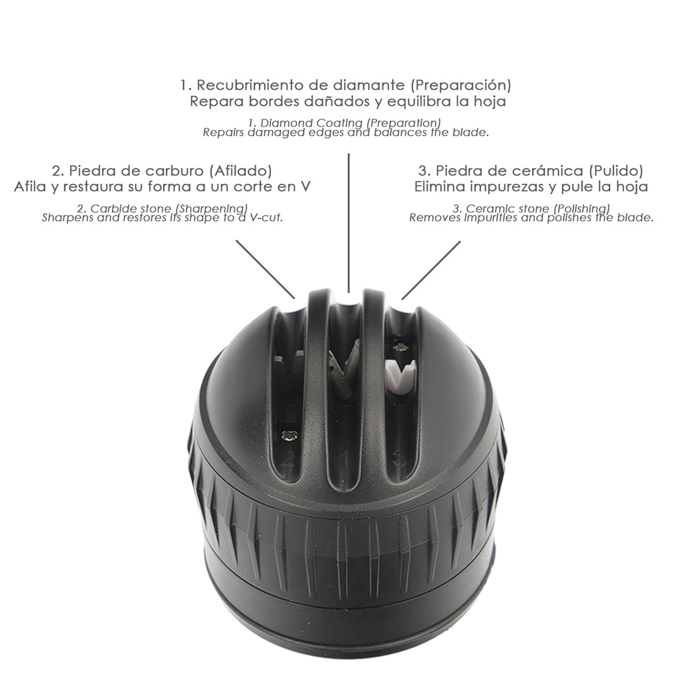 >Ranura 3 – Piedra Cerámica (Pulido): elimina las impurezas y pule la hoja para que quede tan afilada como una navaja.