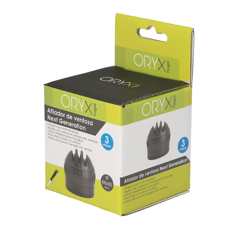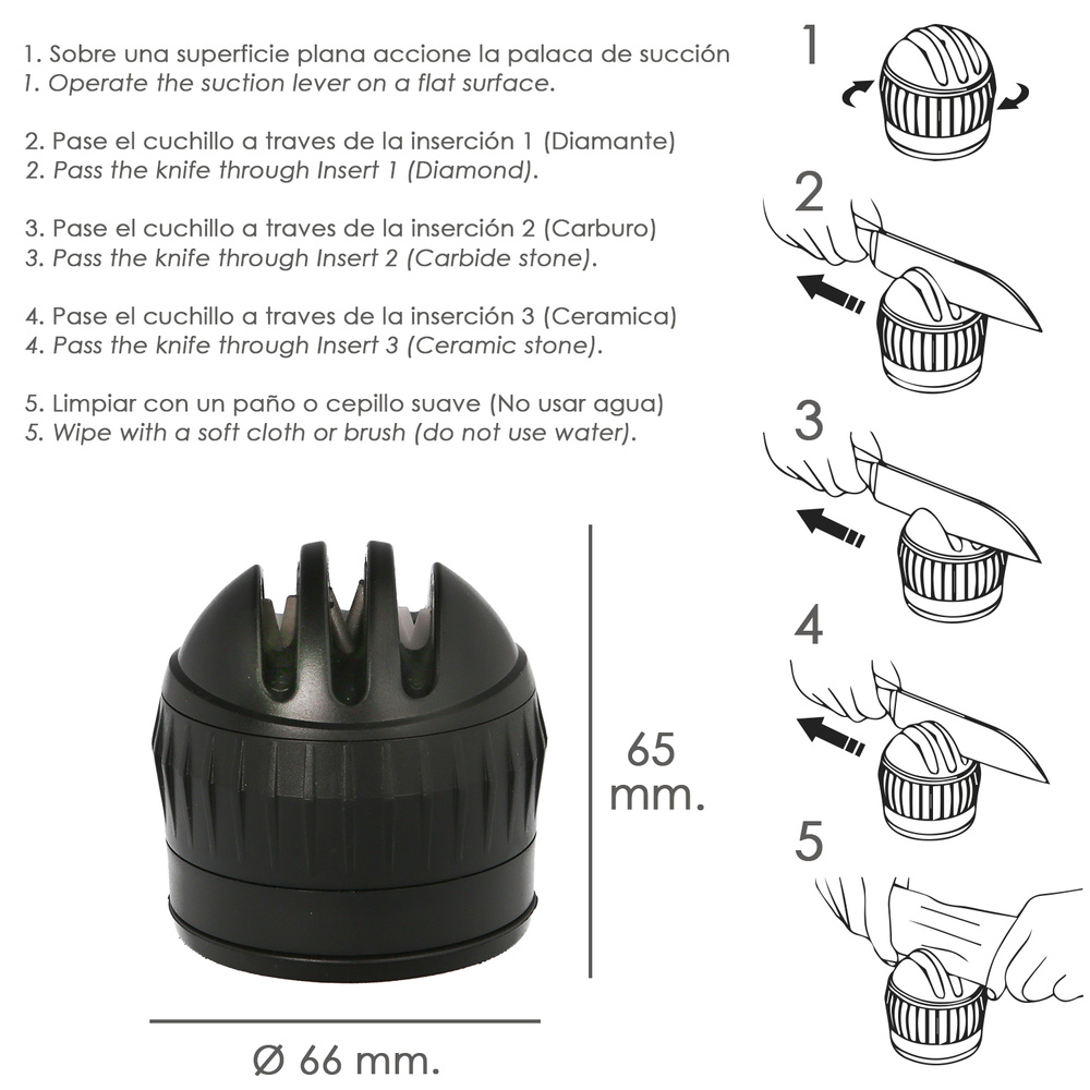 – Afilador de ventosa de 3 etapas de nueva generación, que gracias a su potente ventosa, permite estar fijo mientras se realiza el afilado.