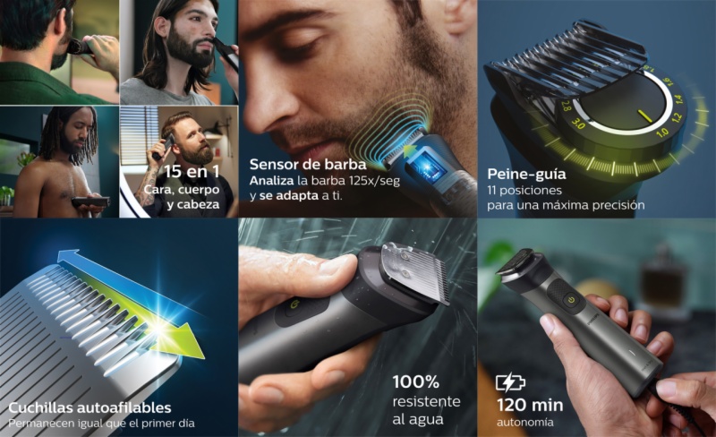 - Crea tu look personal con este versátil recortador, que incluye 15 herramientas de calidad para dar forma a tu cara, cabeza y cuerpo. el peine-guìa de precisión proporciona un corte uniforme a la longitud exacta que quieras.