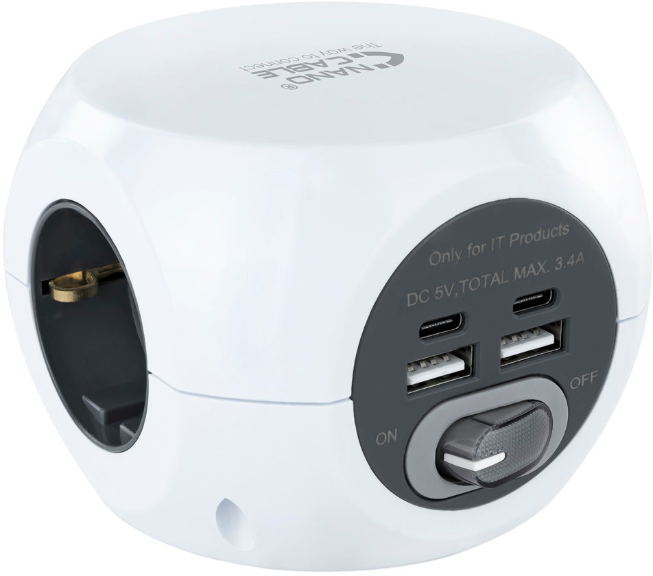 Base de 3 enchufes con 4 USB’s (2 USB A + 2 USB-C), con interruptor