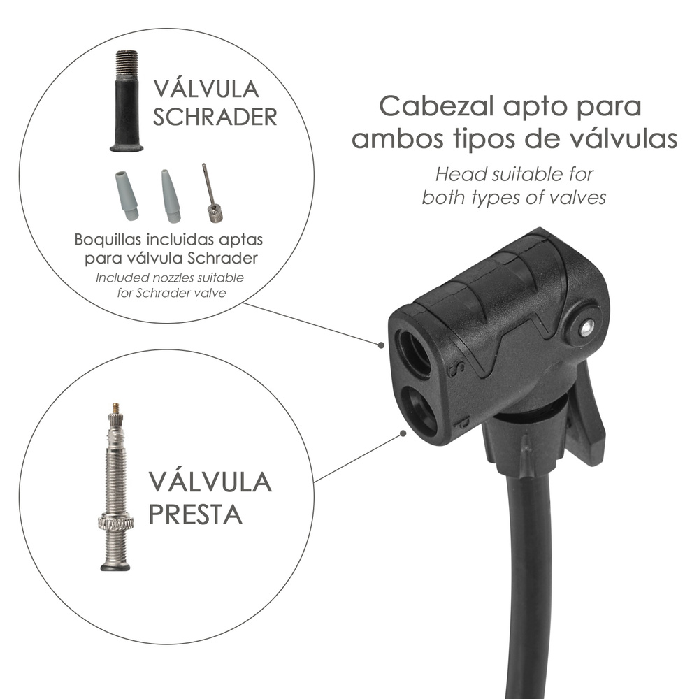 – El cabezal de la bomba está diseñado para poder usar las valvulas Presta y Schrader sin necesidad de adaptadores adicionales, están ambas valvulas en el mismo cabezal.