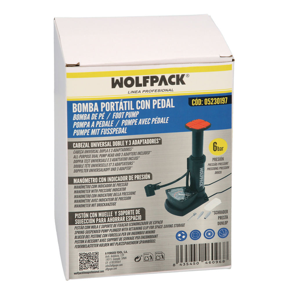 Bomba Inflar Pie Con Pedal y Manometro 6 Bares. Valvulas SCHRADER y PRESTA con Adaptadores. Base Plastico