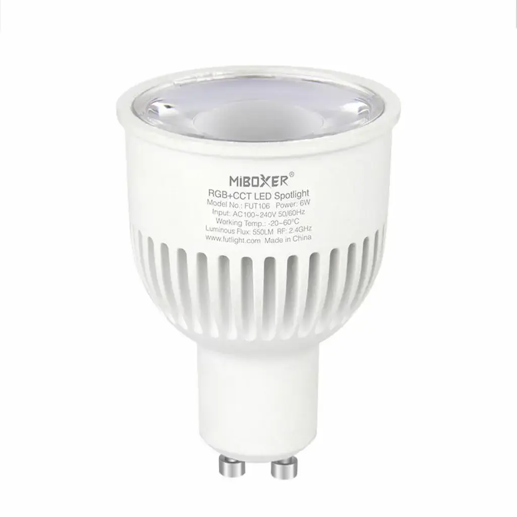 El FUT107 es un foco LED GU10 de 6W con tecnología Dual White, lo que permite ajustar la temperatura de color entre 2700K y 6500K para adaptarse a diferentes ambientes de iluminación.