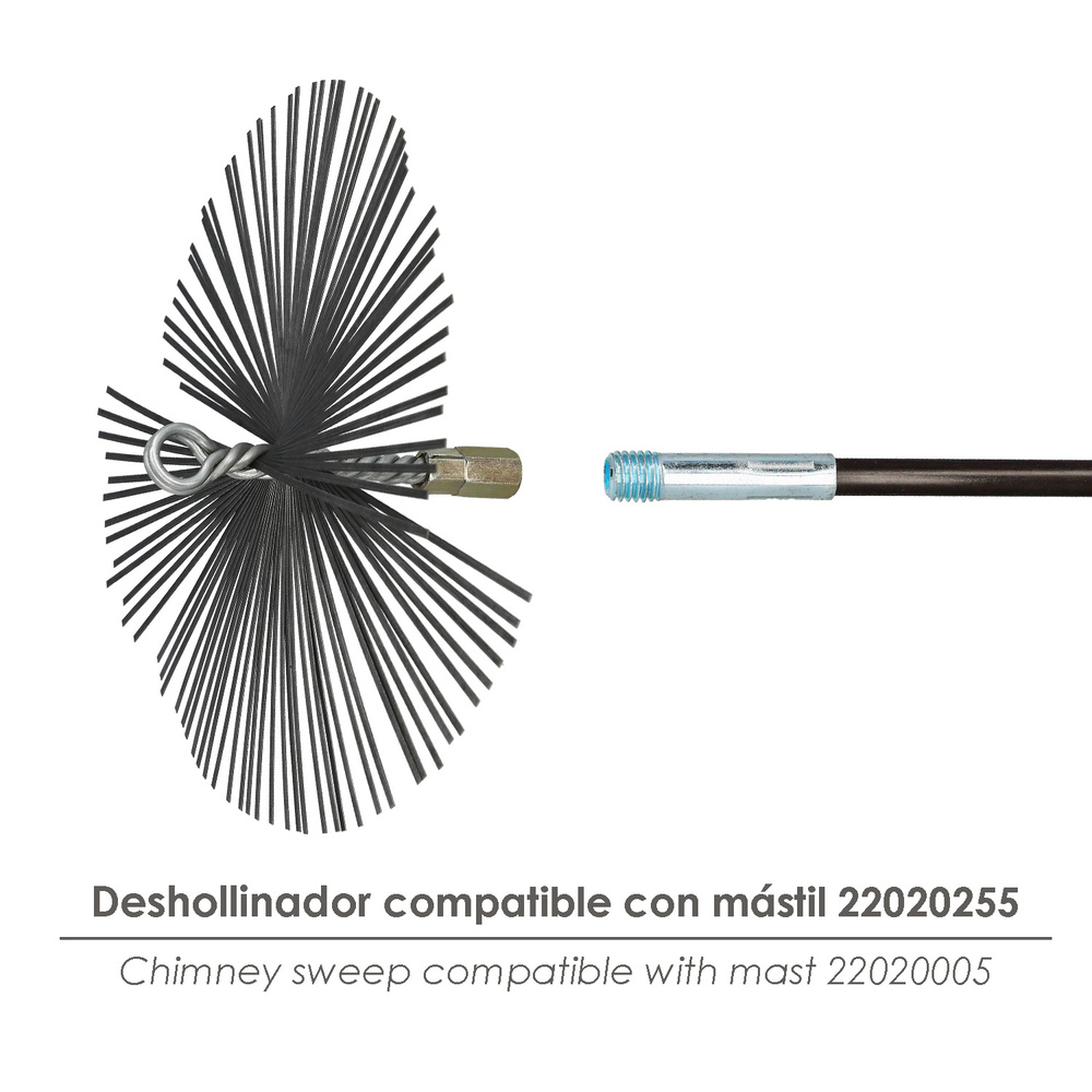 – Su uso es válido para diferentes referencias como el Kit cepillo deshollinador tubo estufa (22020655), el Cepillo limpiador chimenea (22020650) y el Mastil deshollinador de 5 tramos de 140 cm (22020635), lo que lo convierte en un complemento ideal para tu kit de mantenimiento.