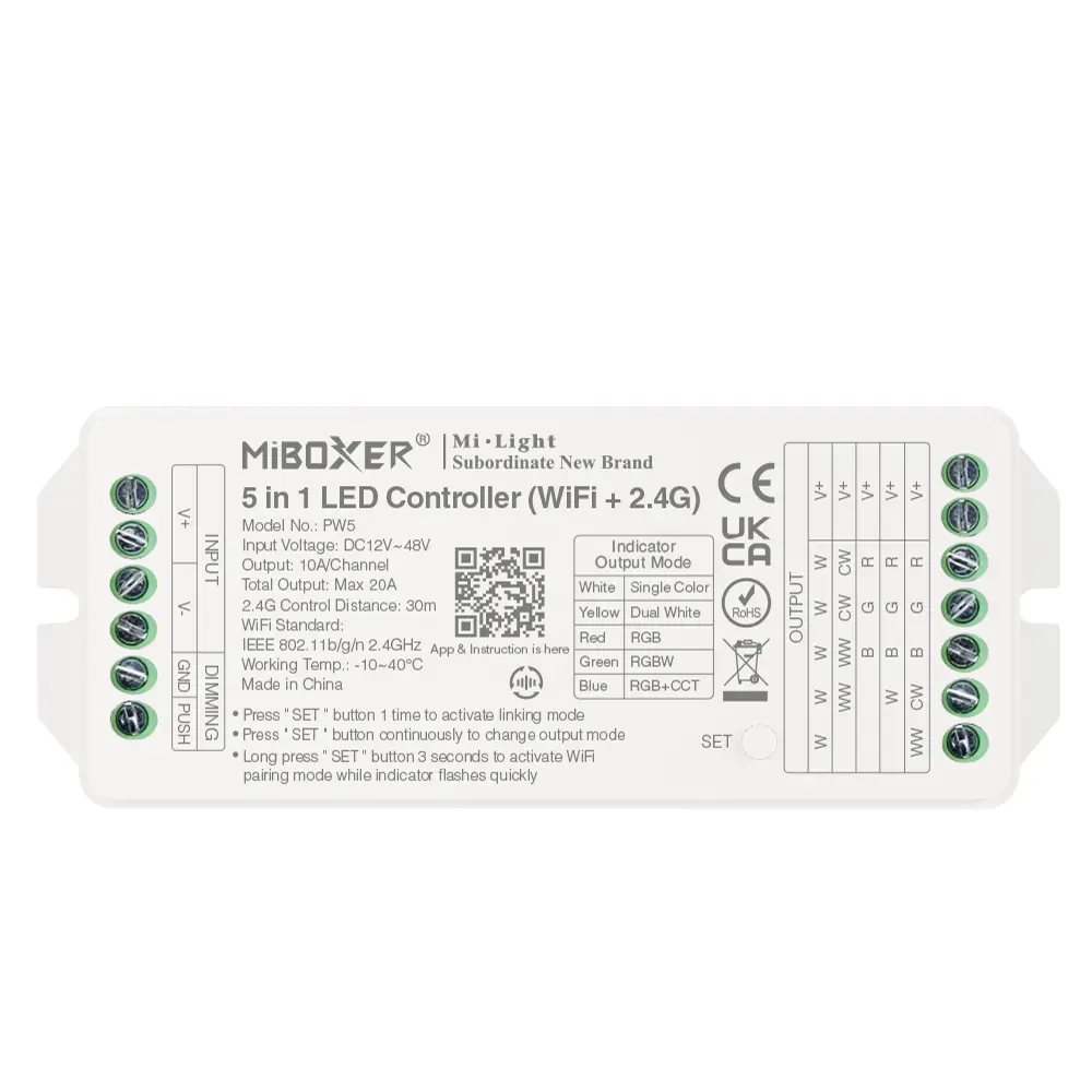PR5 adopta la tecnologÃa inalámbrica 2.4GHz ampliamente utilizada. Controlado por control remoto inalámbrico, también con control por teléfono inteligente y control de larga distancia 4G (se necesita puerta de enlace 2.4GHz). Controlador con RGB, brillo, modo de salida CCT. Un mando a distancia compatible controla muchos controladores al mismo tiempo. Ampliamente utilizado en el control de la iluminación de hoteles y del hogar.