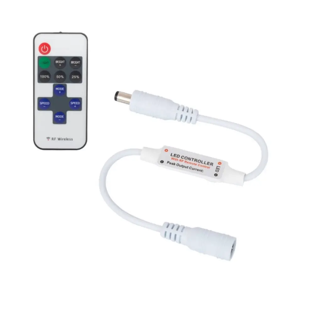 Controlador de pequeño tamaño para tiras LED de 5/12V que permite gracias a su mando a distancia modificar la intensidad y la velocidad de las luces LED. No incluye pins.
