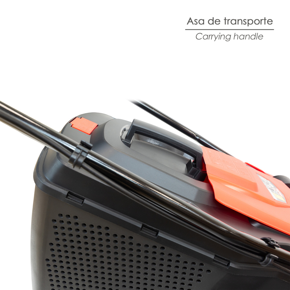– Equipado con ruedas delanteras de 127 mm y ruedas traseras de 140 mm, este cortacésped garantiza una maniobrabilidad óptima y facilita su desplazamiento en todo tipo de terrenos. Además, incluye un amplio cesto recoge hierba de 50 litros, que te permitirá trabajar de manera continua sin interrupciones.