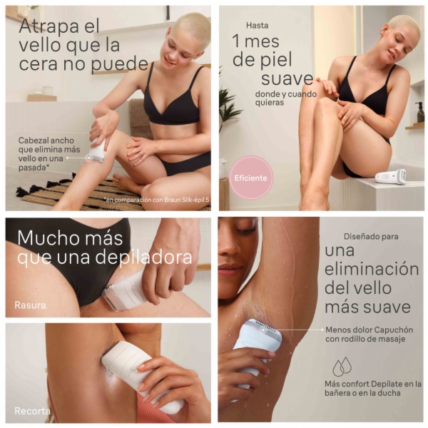• Eficiente: el cabezal ancho elimina más vello (comparado con braun silk-épil 5) en una pasada. la depiladora atrapa el vello corto (0,5 mm) que la cera no puede atrapar