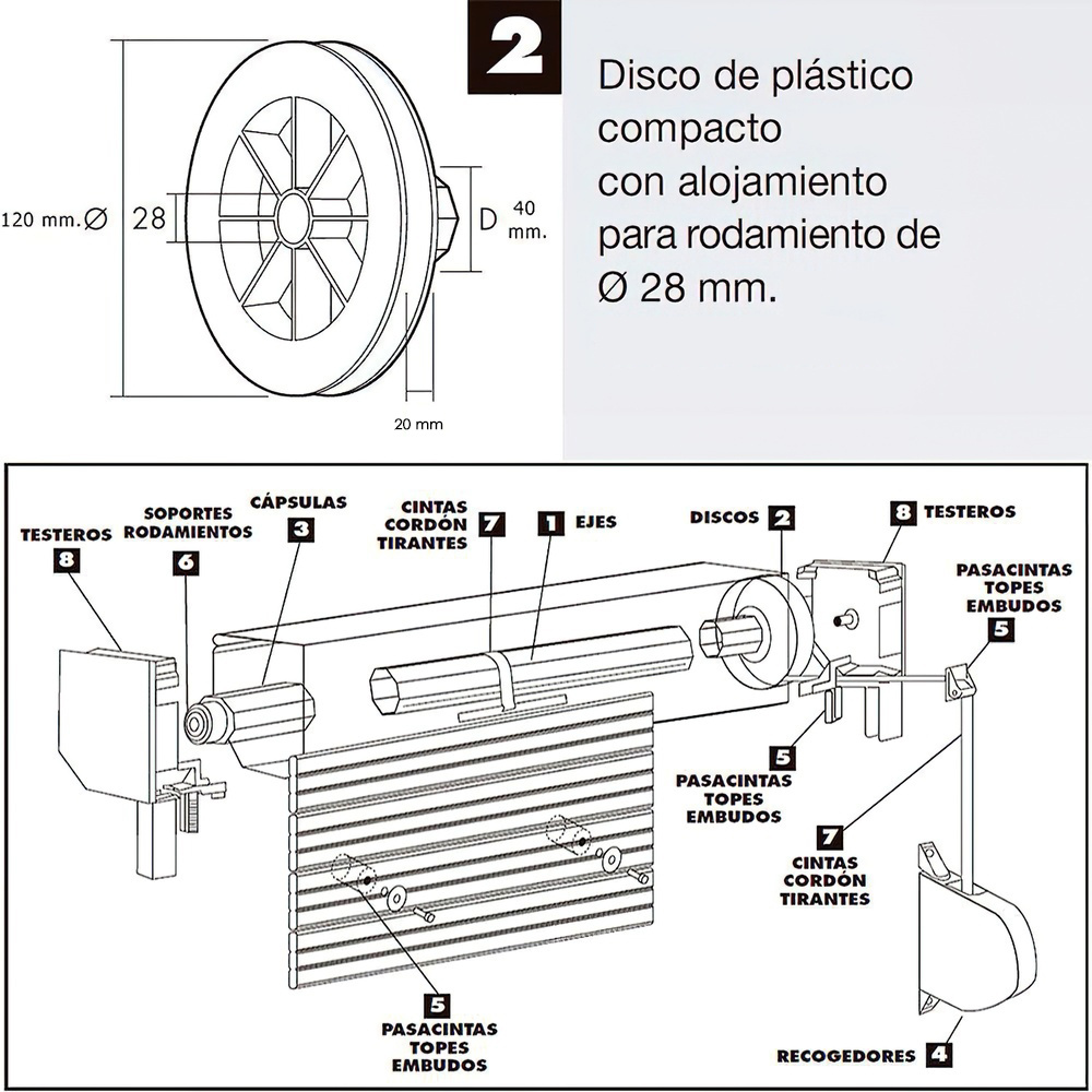 Disco Plastico Compacto Para Persianas. Rodamieto 120×40 mm. Para cintas hasta 20 mm.