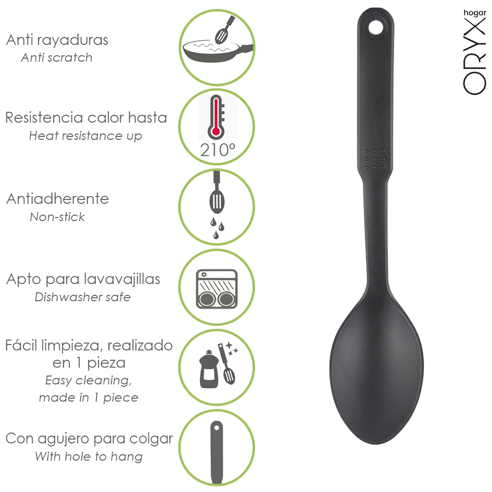 – Realizado en nylon, material ligero y resistente. Material similar a la silicona, ya que ambos materiales no absorven olores ni sabores ademas pueden usarse en todo tipo de sartenes y ollas, ya uqe no rayan la base.