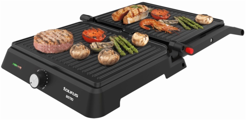 • El grill bistro de taurus, con una potencia máxima de 2600w, es un aparato 2 en 1 que funciona como grill y plancha de asar. ofrece una gran superficie de cocción de 29×23 cm, perfecta para cocinar carnes, verduras, sándwiches y más.