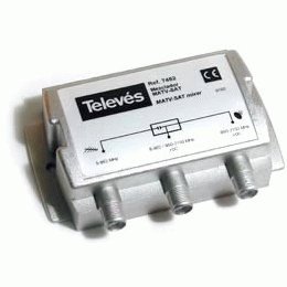 Conversor LNB quattro, con 4 salidas, cada una con una combinación de polaridad/banda fija (Ha, Hb, Va, Vb). Cada salida está marcada con su color: negro para Vb, rojo para Va, amarillo para Ha y verde para Hb.