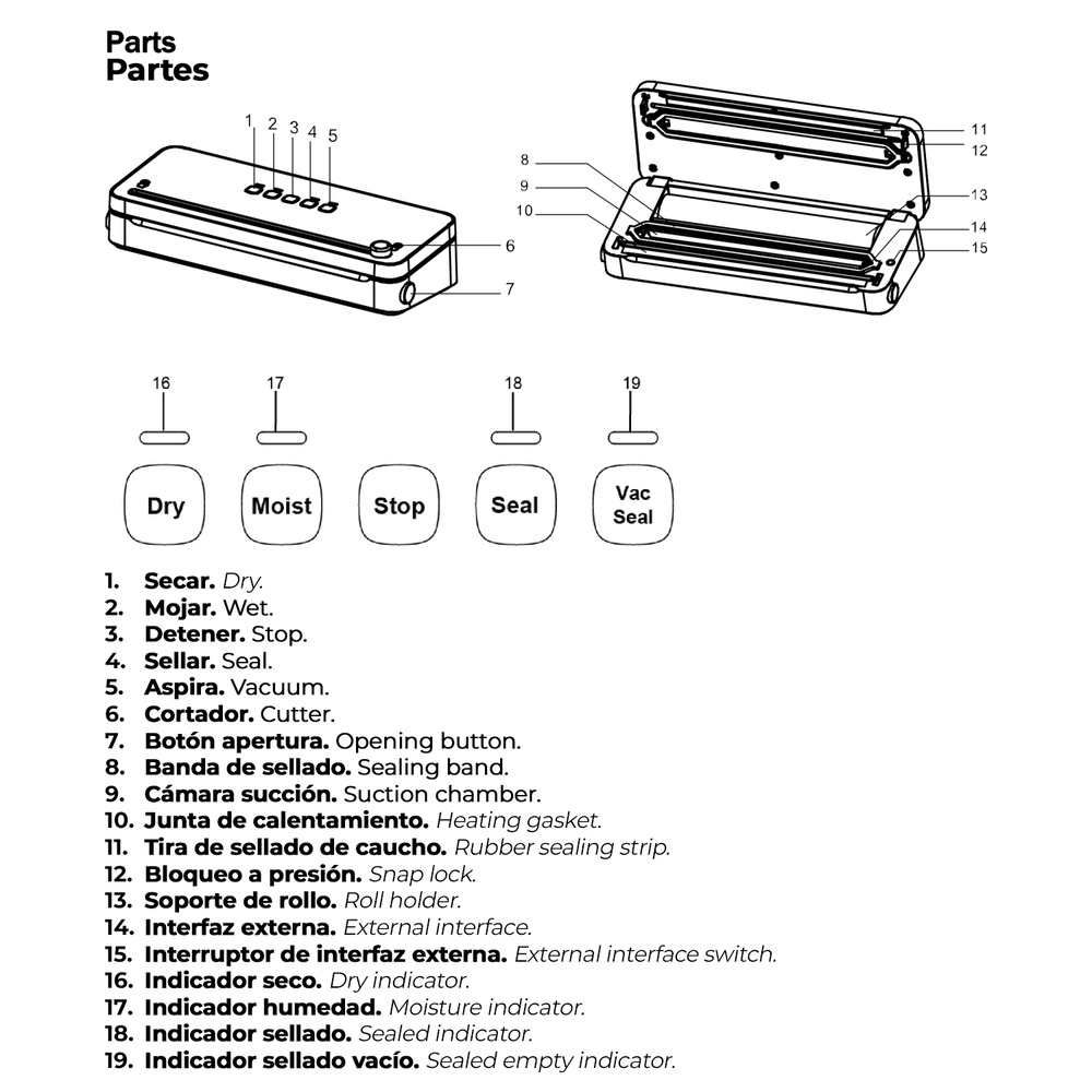 – Indicadores LED de alimentos seco, humedo, sellado, sellado con vacio.