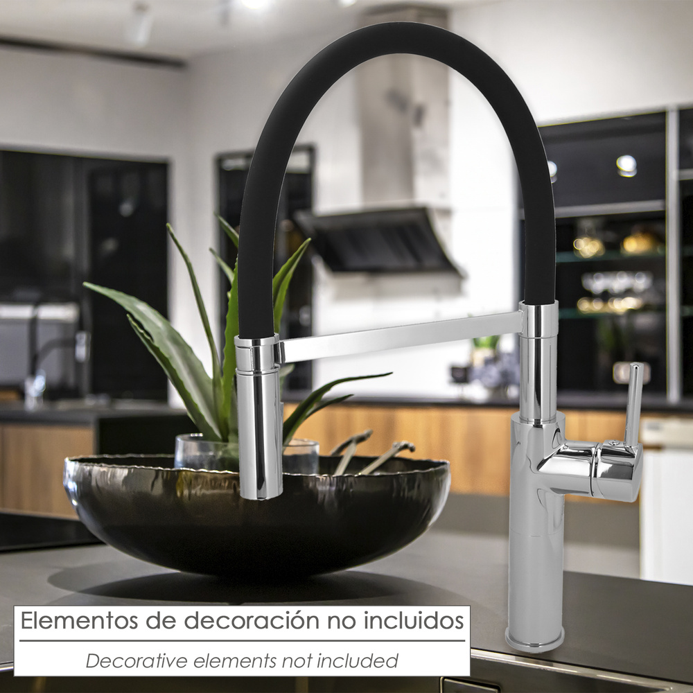 – La manguera flexible ofrece la posibilidad de llenar y limpiar ollas, jarras grandes etc. Gira 360º, otorgando un amplio rango de movimiento dentro y fuera del fregadero.