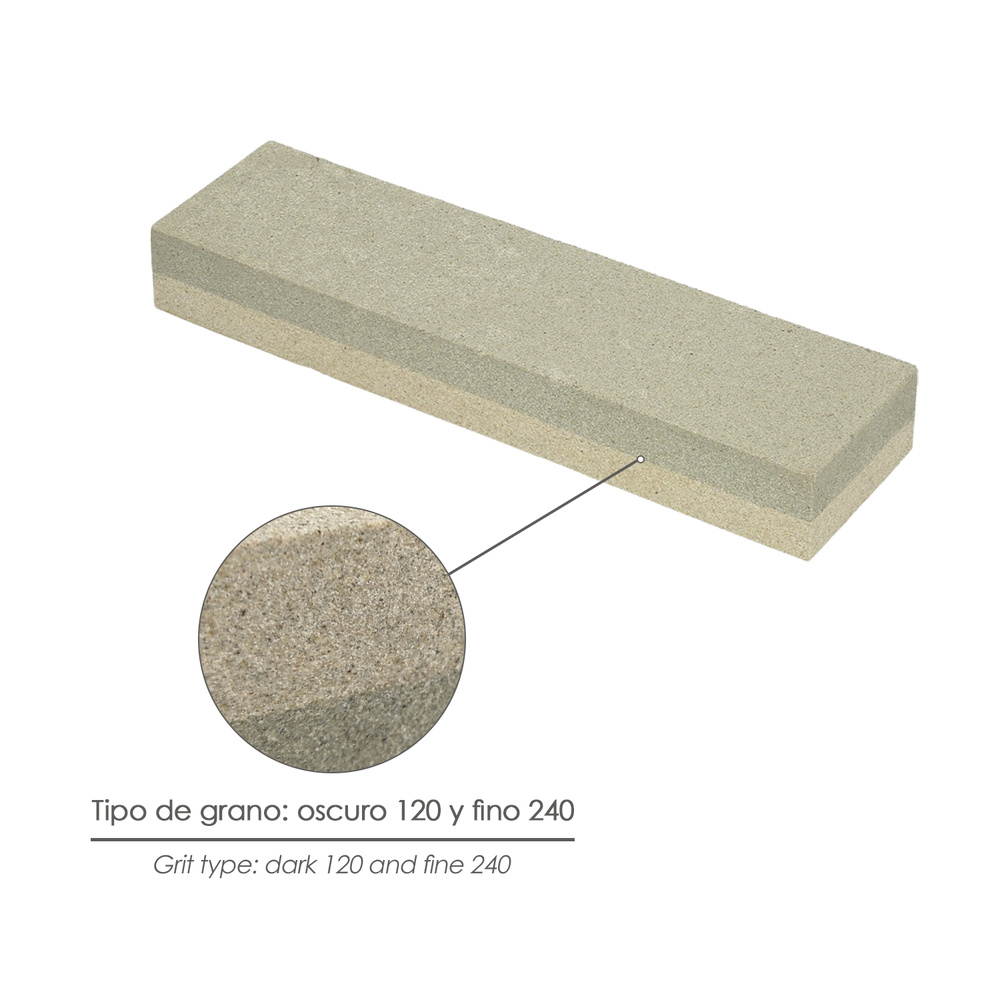 – El grano grueso, del lado oscuro 120, consigue un borde afilado. El grano fino, del lado clarito 240, es ideal para terminar y pulir el borde.