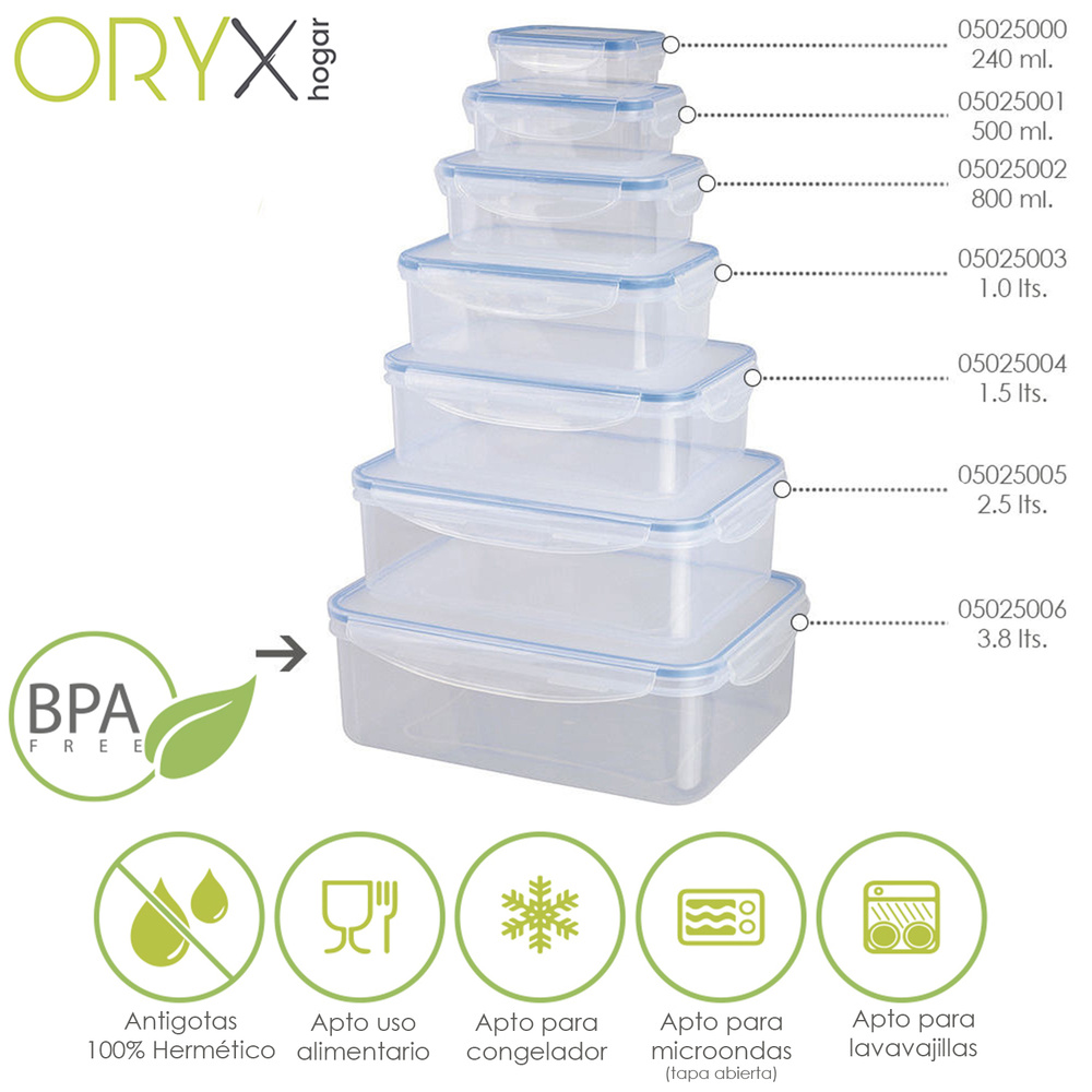 – Recipientes herméticos para una mejor conservación y un transporte sin derrames. Las tapas cuentan con un sistema de 4 cierres de bloqueo además están realizadas en silicona inyectada que se adhiere al recipiente aislando los alimentos de gérmenes y olores externos y favoreciendo su perfecta conservación.