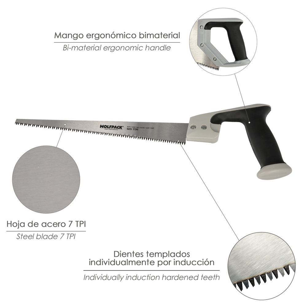 – Dientes del serrucho templados con triple afilado, cuenta con una separación de 7 TPI, especialmente diseñado para maderas pladur, yeso y escayola.