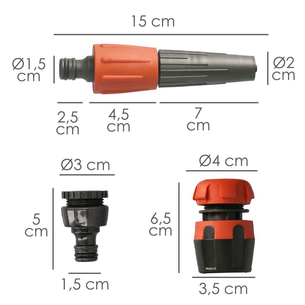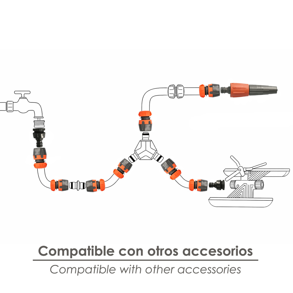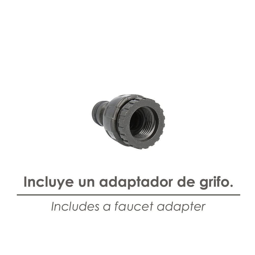 – Incluye un lanzarriegos, dos conectores de manguera 1/2″ (uno con funcion stop) y un adaptador de grifo.