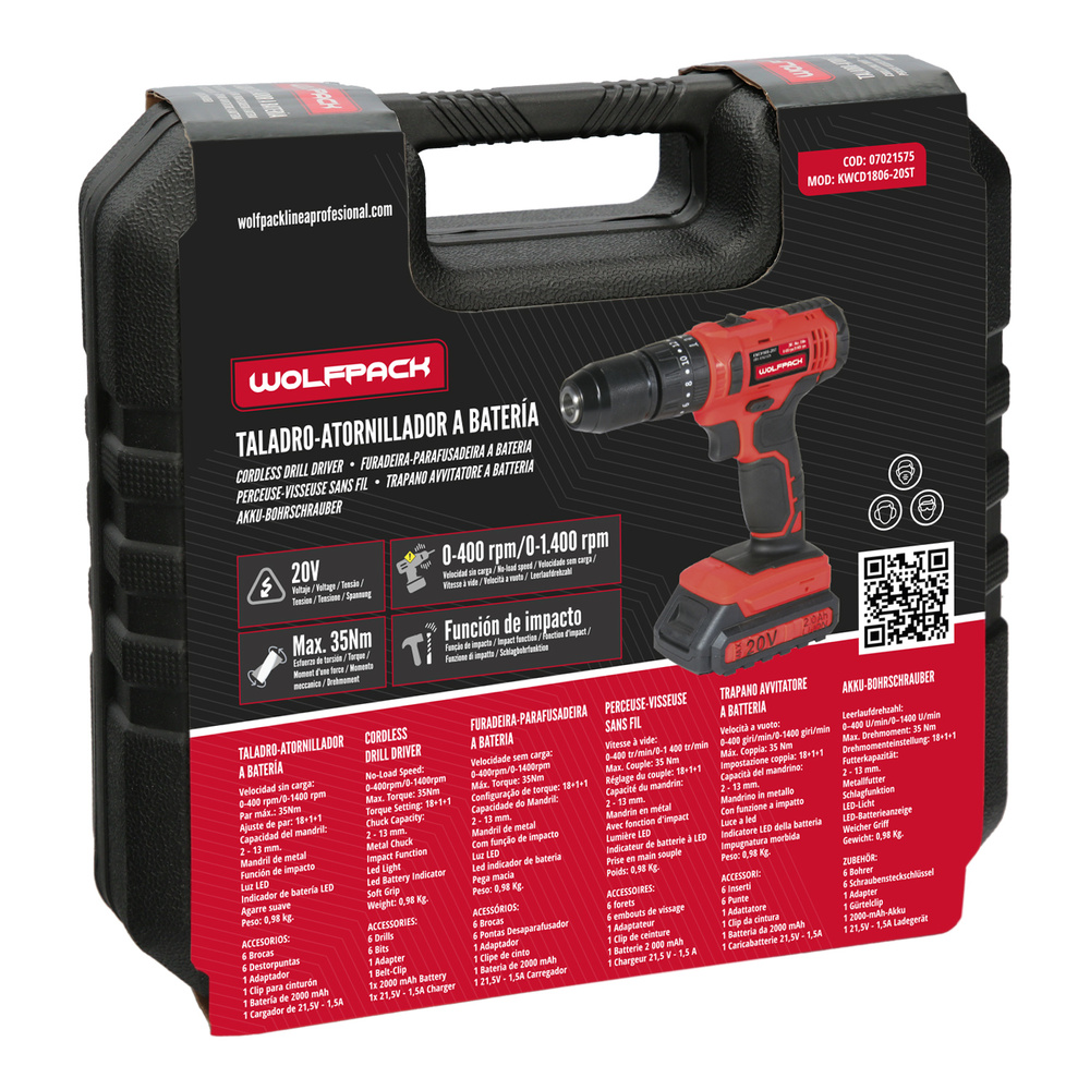 Taladro Atornillador 20 V. Con 2 Velocidades y Percutor. Bateria 2 Ah. Par Apriete 35 Nm.