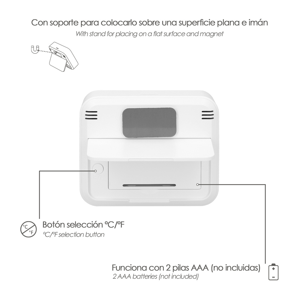 – El higrómetro de interior cuenta con un orificio para colgarlo en la pared o un soporte retráctil en la parte posterior para colocarlo en una mesa.