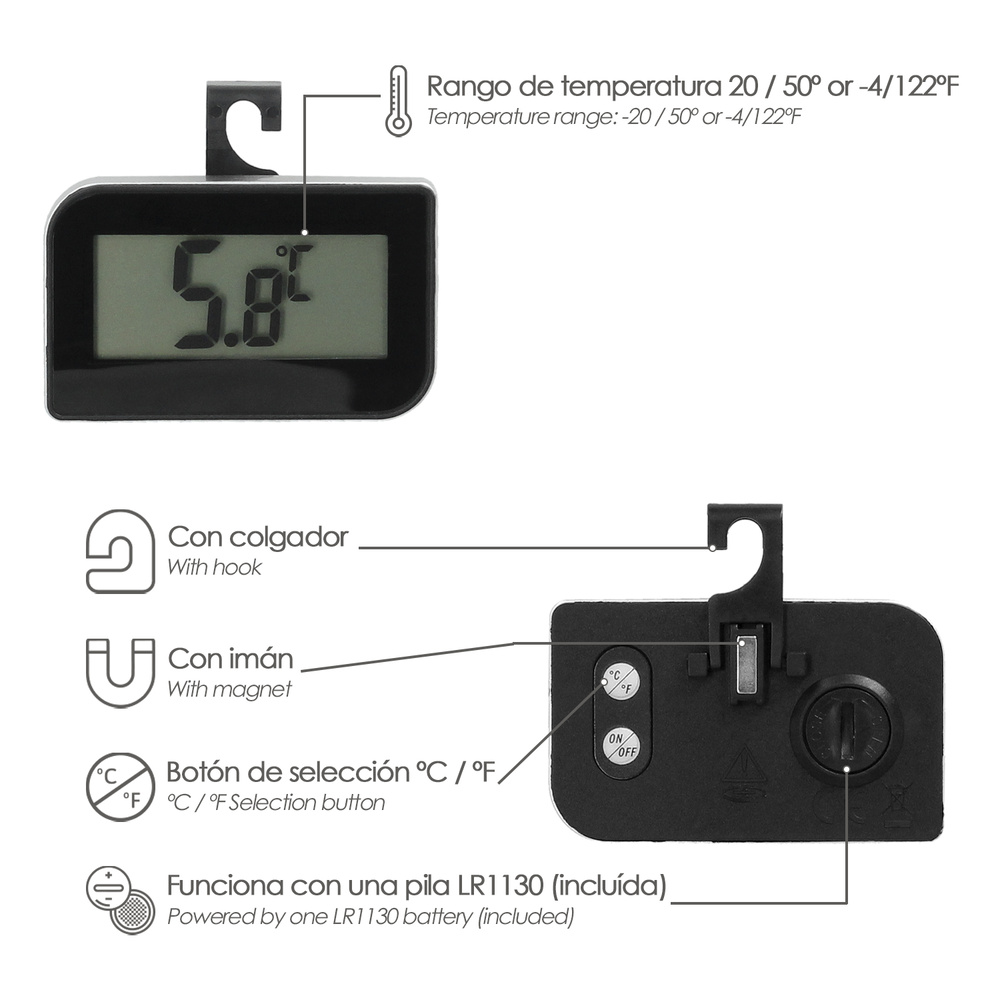 – Ofrece tres opciones de instalación. Puedes fijarlo a la puerta del refrigerador con su imán incorporado, colocar el termómetro sobre una superficie plana utilizando su soporte, o colgarlo en un estante de la nevera gracias a los ganchos integrados. Es compacto y fácil de transportar, ideal para cualquier espacio.