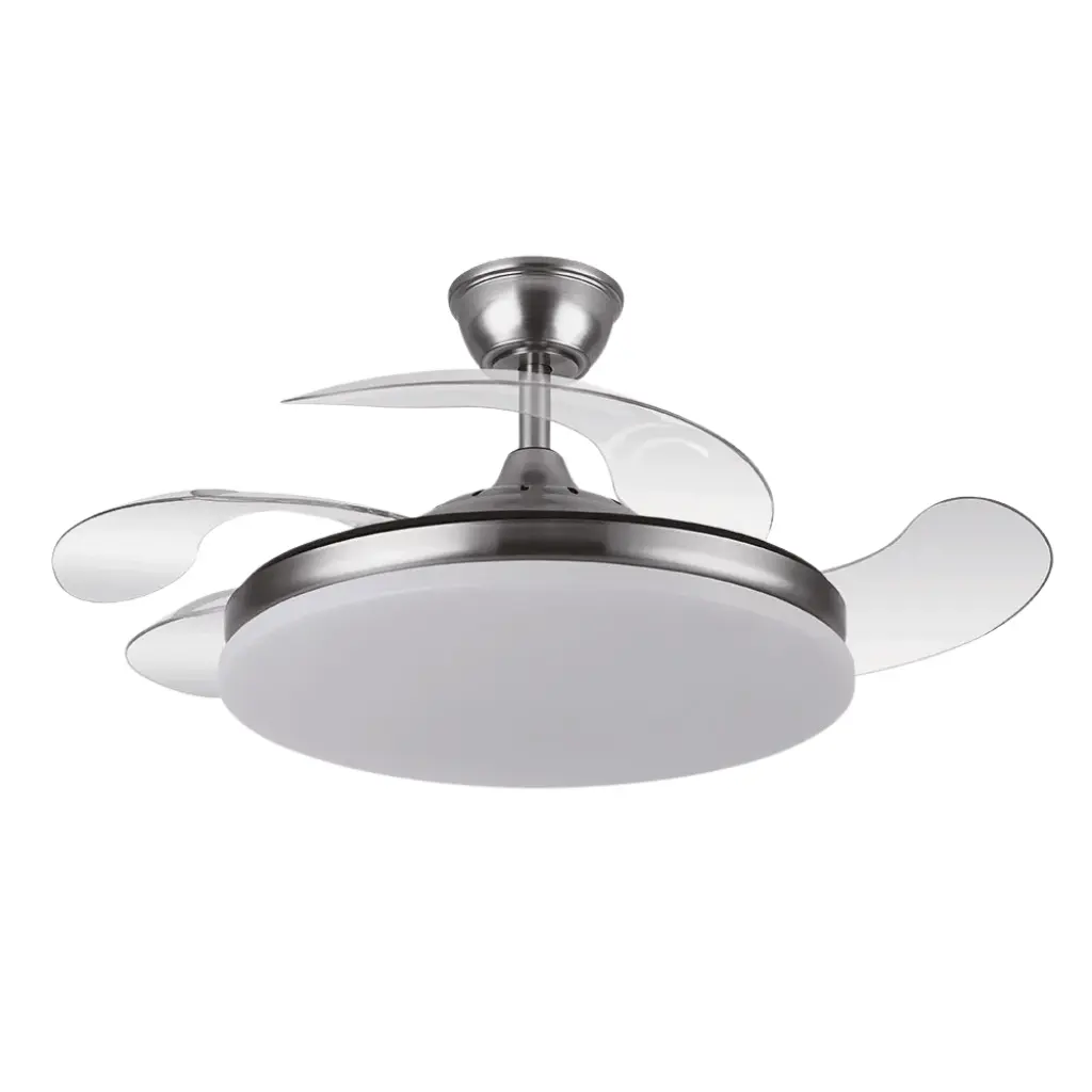 Ventilador DC de la serie BANDIDO realizado en metal, policarbonato y ABS, en color BLANCO con cuatro aspas DESPLEGABLES de ABS transparente muy resistentes.